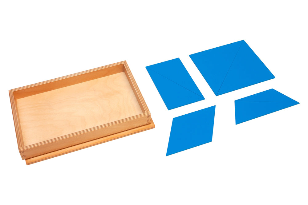 The Constructive Triangles consists of a set of 5 wooden boxes that progressively introduce children ages 3-5 to the different shapes that can be formed with various triangles. Although the material aims to introduce math concepts, it is considered a sensorial Montessori material. Geometry is introduced through the children's senses using bright colors, sharp edges, and bold eye-catchy outlines to guide eyes and fingers.