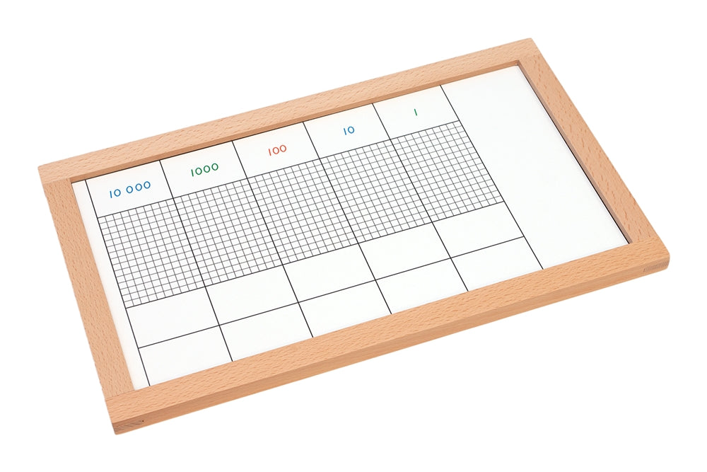 The Dot exercise enables the student to display his ability to master decimal system addition. This material also helps present the more abstract concept of column addition with the element of carrying over. This is a framed board covered with a clear protective sheet. It can be written on multiple times.