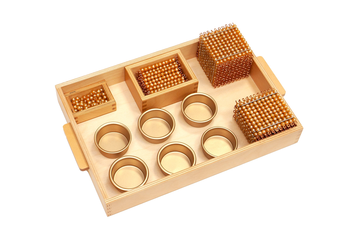 The Golden Bead Material introduces a group of children to concepts in the formation of complex numbers and the processes of addition, subtraction, multiplication and division.