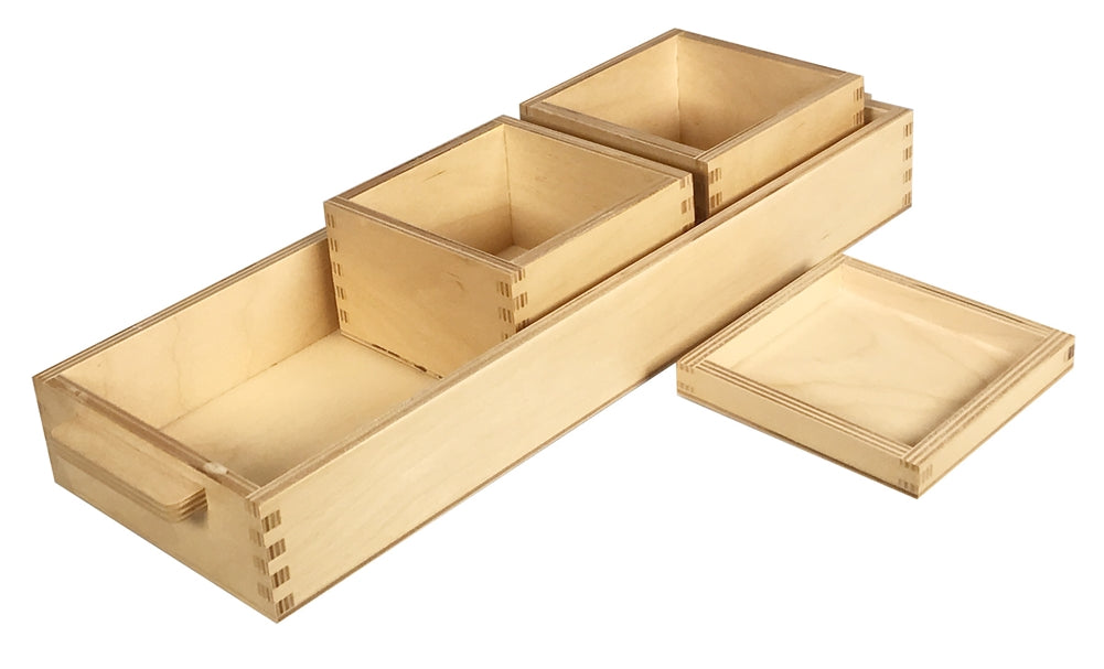 This is a wooden tray that contains the following golden bead material: cube of 1000, nine squares of 100, nine bars of 10, and nine golden bead units. With adequate representation, this material demonstrates place value and the concept that a decimal category cannot exceed nine.