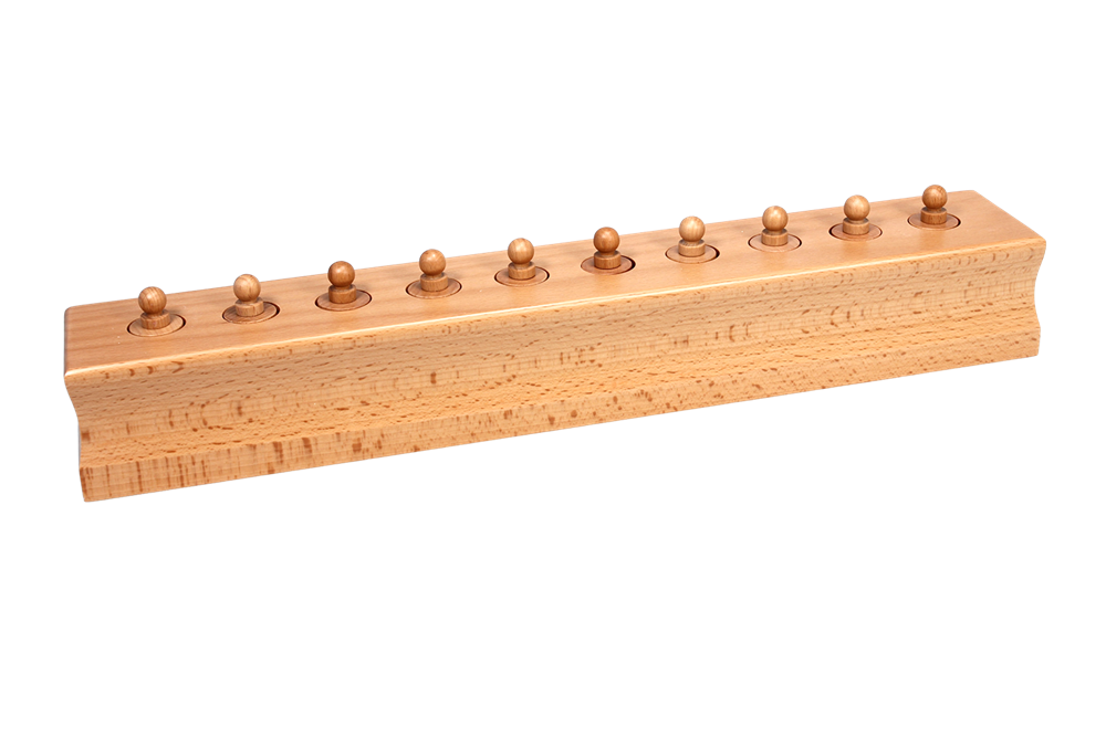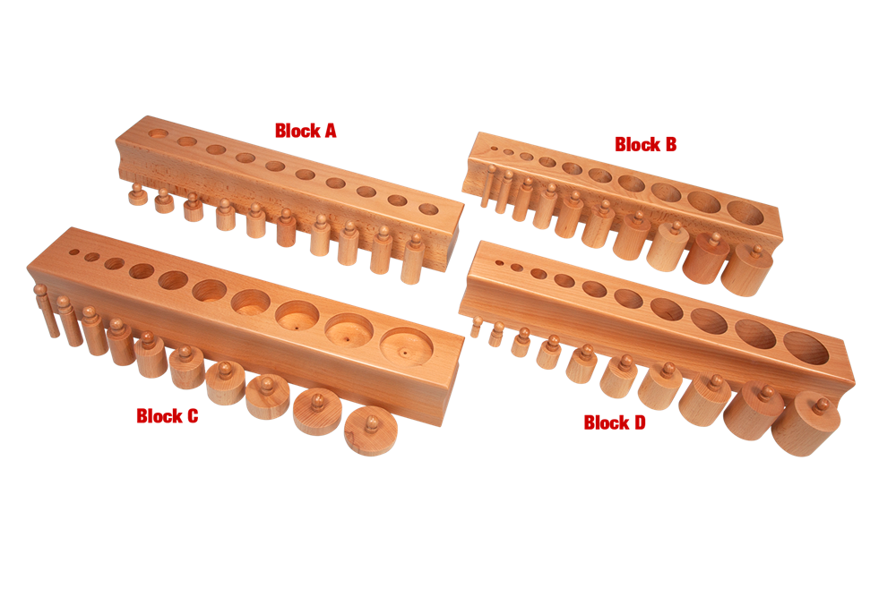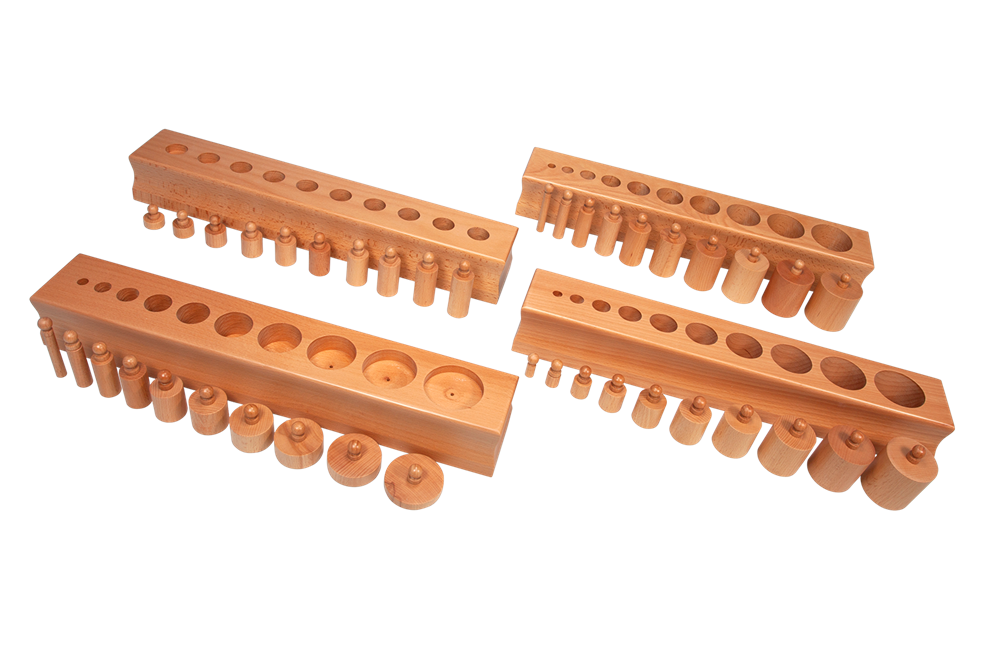 This is a set of four wooden cylinder blocks lacquered and hand crafted to a smooth satin finish. Each block contains ten knobbed cylinders of varying dimensions. The cylinder blocks help develop the concept of visual discrimination of size.